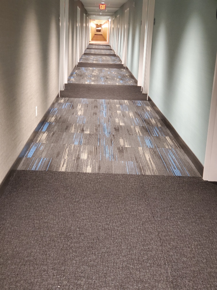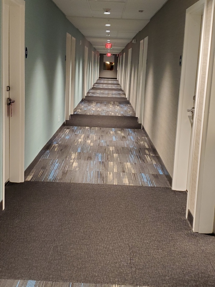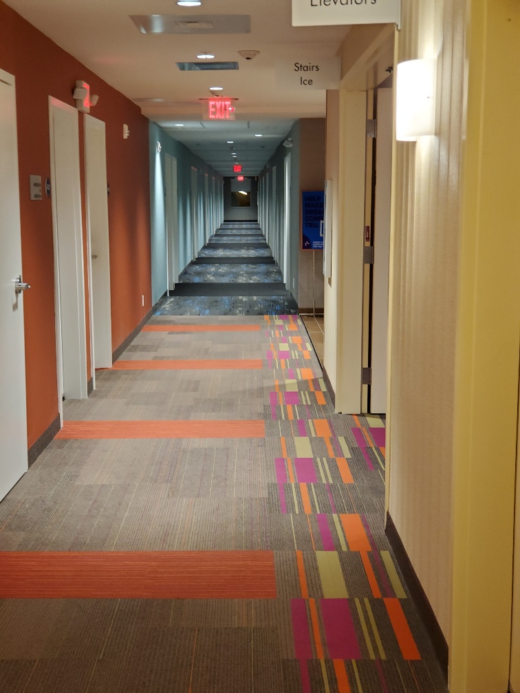 This hotel is a Hilton Home2 Suites mixed with Hilton Tru which are rooms. The room section of the hallway looks like this.