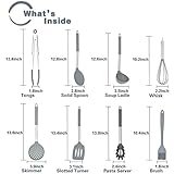 Silicone material our kitchen utensils are made out of food grade silicone which is safe for cooking great set of silicone utensils to protect your nonstick cookware would not scratch any pots or pans Various utensils 12 pieces set of cooking tools include spatula skimmer spoon slotted spoon slotted turner ladle spoonula pasta server tong basting brush whisk utensil holder meets all your needs for cooking