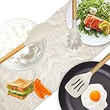 The wooden handle is antiscaldingThe silicone soft and does not hurt the pot this kitchen utensil handle is made of solid wood Smooth and comfortable to the touch it completely prevents the heat transfer during the cooking process Avoid scalding the chefs hands Deep soup ladle solid serving spoon slotted spoon flexible spatula round spatula pasta server slotted turner etc Are made from food grade silicone No warping soft completely protect your pot from being scratched