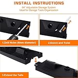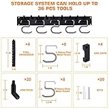 Adjustable garage storage system64 inch garage wall organizer composed of 4 packs of 16 abs rails 16 nonslip metal hooks and 20 hanging pegs which is the perfect tool hangers for garage wall to hang various garden tools like rakes shovel spade broom mop even door keys umbrellas ropes saws shears you name it